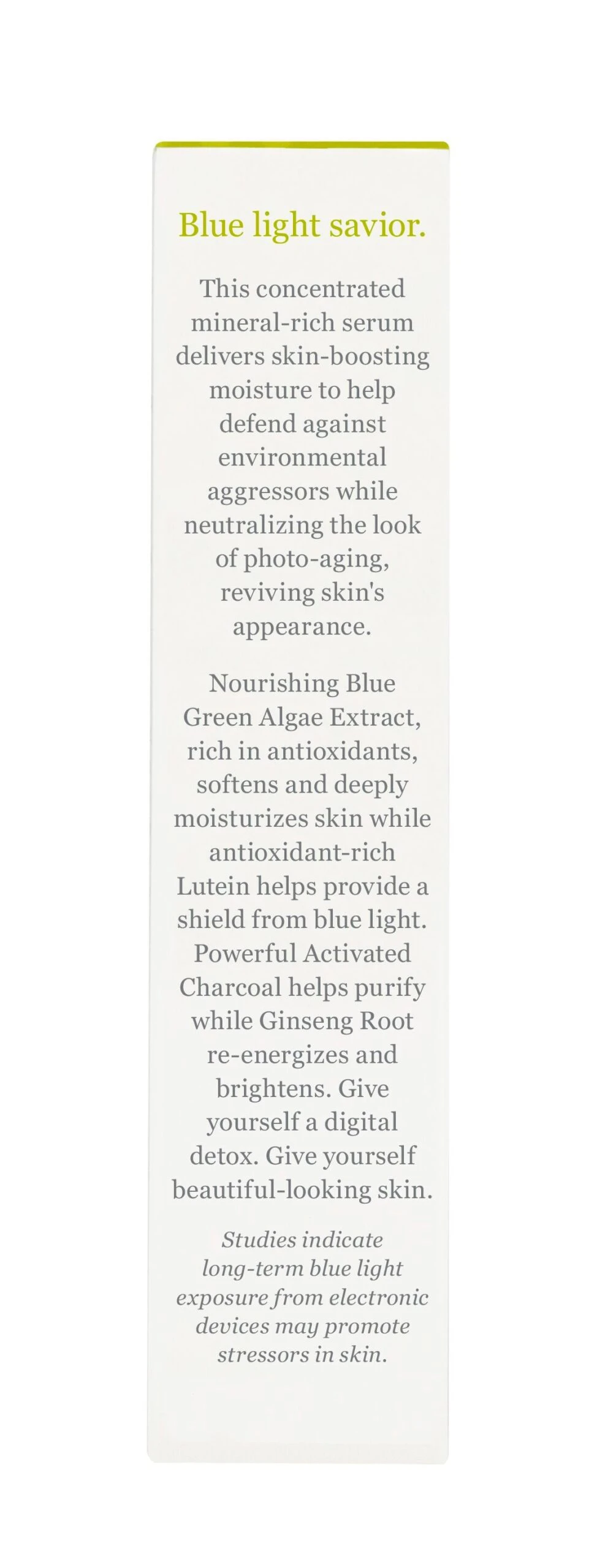This highly effective serum provides optimal balance while reducing the effects of environmental and digital pollution.
