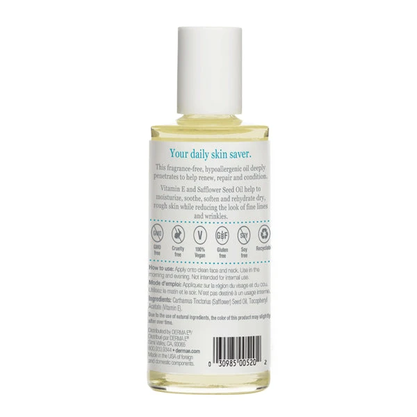 - Pour a small amount of Vitamin E Oil onto the fingertips and apply to the entire face, neck and dry flaky patches in light upward strokes. Use as desired.